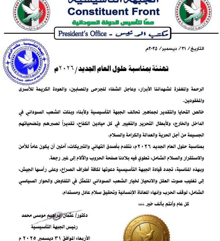 تهنئة السيد رئيس الجبهة التأسيسية بمناسبة حلول العام 2026 م